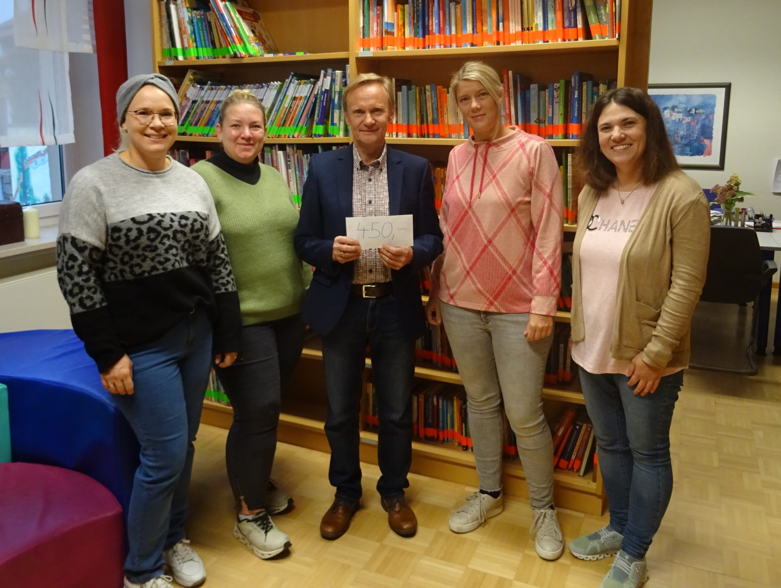 Zum Foto: Schulleiter Schmidbauer nimmt die Spende von der Basarteamabordnung entgegen (von links: Christiane Fendl, Ramona Kerscher, Nina Breu, Katja Mühlbauer, aufgenommen von Melanie Vallenthin)