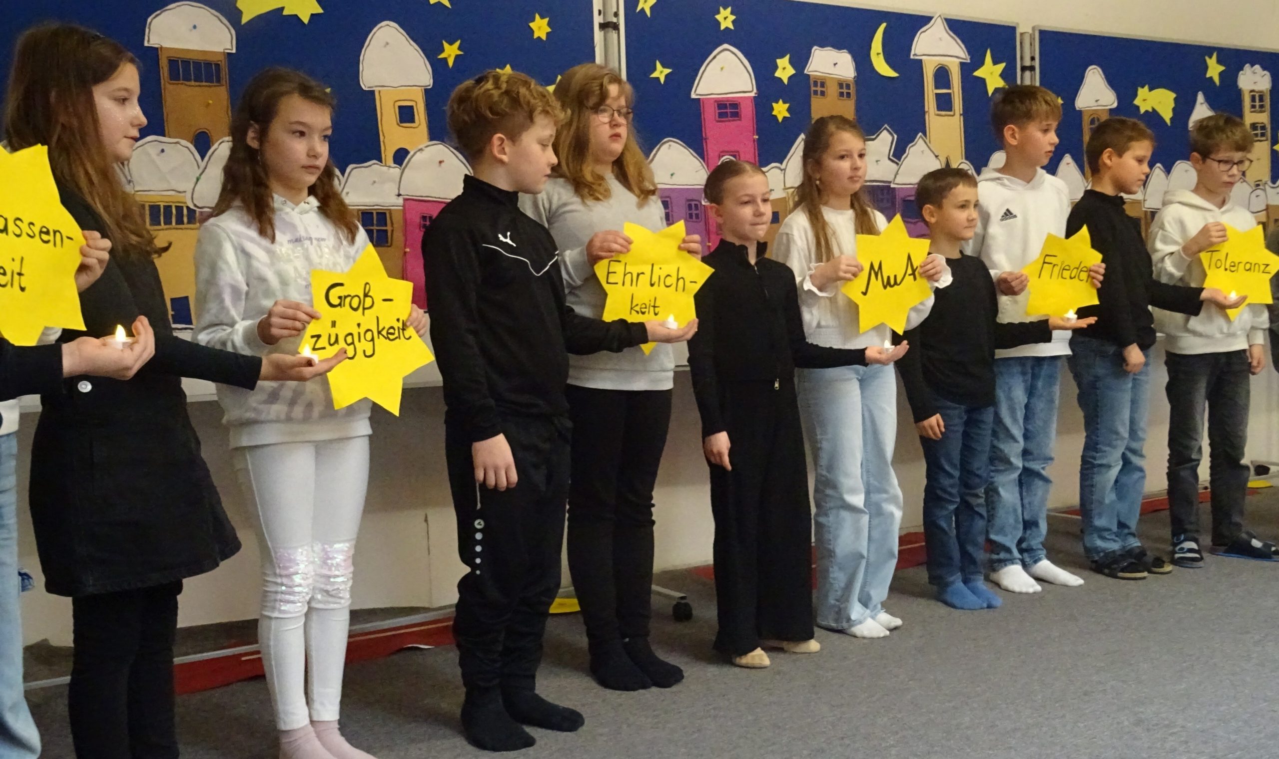 Alle Klassen hatten ein abwechslungsreiches und ansprechendes Programm vorbereitet. Den Auftakt gestaltete die erste Klasse mit dem Lied „Weihnachtszeit“. Im weiteren Verlauf der Feier ließen die Kinder die Zuschauer an den Wünschen und Träumen der „Winterwichtel“ teilhaben, die sich noch an den ganz einfachen Dingen des Lebens erfreuen können. Die Schülerinnen und Schüler der zweiten Klasse verzauberten das Publikum anschließend mit einem stilvollen Lichtertanz und einem stimmungsvollen Weihnachtsgedicht.